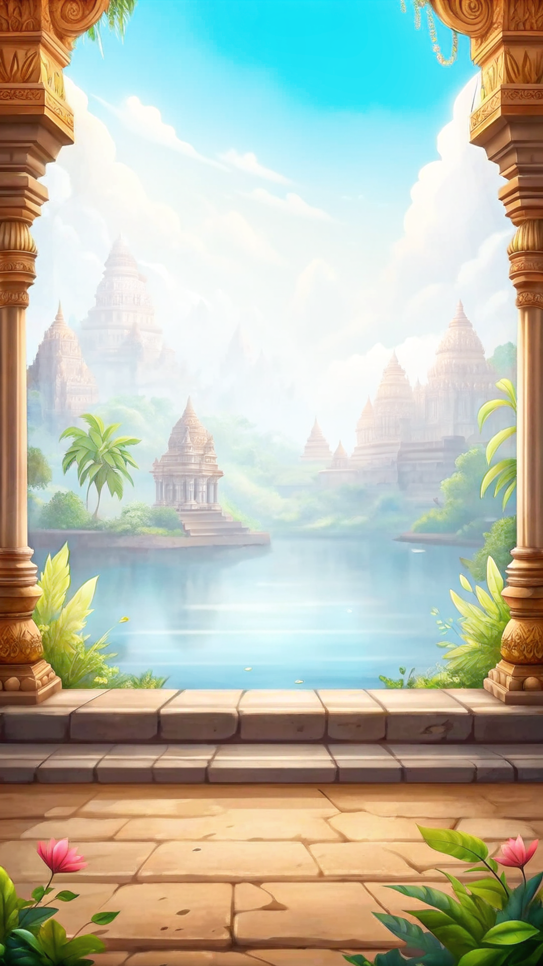 Immerse yourself in the beauty of history with this breathtaking view of an Ancient Temple Landscape Background. Imagine the impressive temple peaks standing tall over vibrant green trees, perfectly mirrored in the calm waters that surround them. Intricately carved pillars in the foreground complement the scene perfectly, giving a sense of both grandeur and antiquity. The combination of exotic plants, delicate lotus flowers, and soft golden light illuminating the temple makes this picture an excellent image for digital art, fantasy paintings, cultural presentations, or gaming backgrounds. Take advantage of this high-quality background to enhance your creative work, or explore even more amazing temple-themed scenes at Historical Art Collection and Scenic Temple Landscapes.