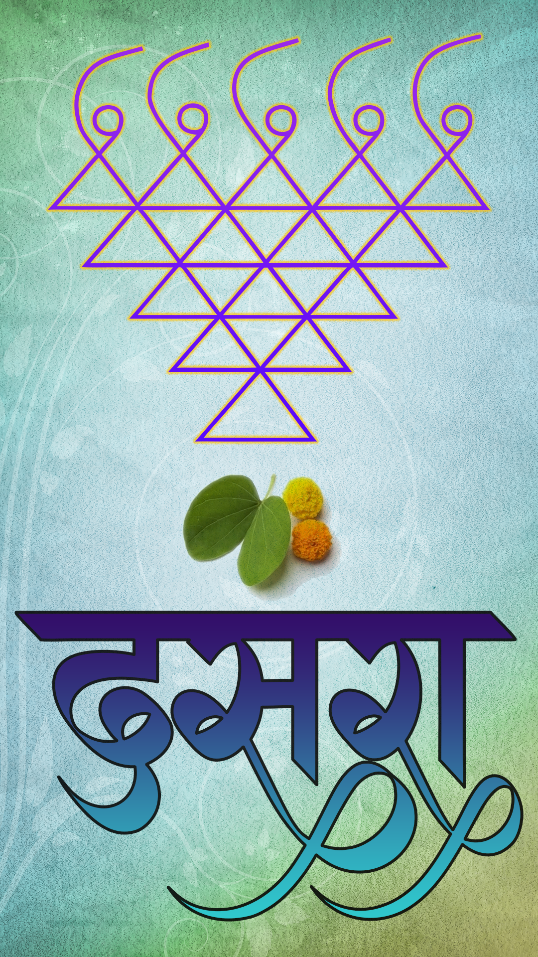 Marathi Dasara wishes pictorially expressed with an innovative idea of the cultural-art-festive greeting combination. The topmost holy Saraswati Chinh in the frame, with a strong intellect and wisdom association, is probably the source of the idea of blending art and science. The image gets more beautiful and expressive with the addition of the text “दसरा” in a funky calligraphic font and the Apta leaf (known as सोने) and marigold flowers being two of the most important elements of the festival besides the decorative aspect.