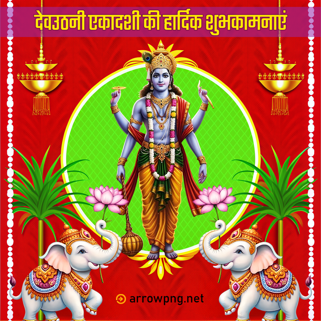 This downloadable Dev Uthani Ekadashi Image depicts Lord Vishnu in divine attire with a radiant festive background and Hindi message “देवउठनी एकादशी की हार्दिक शुभकामनाएं”. Ideal for sharing or designing festive greetings.