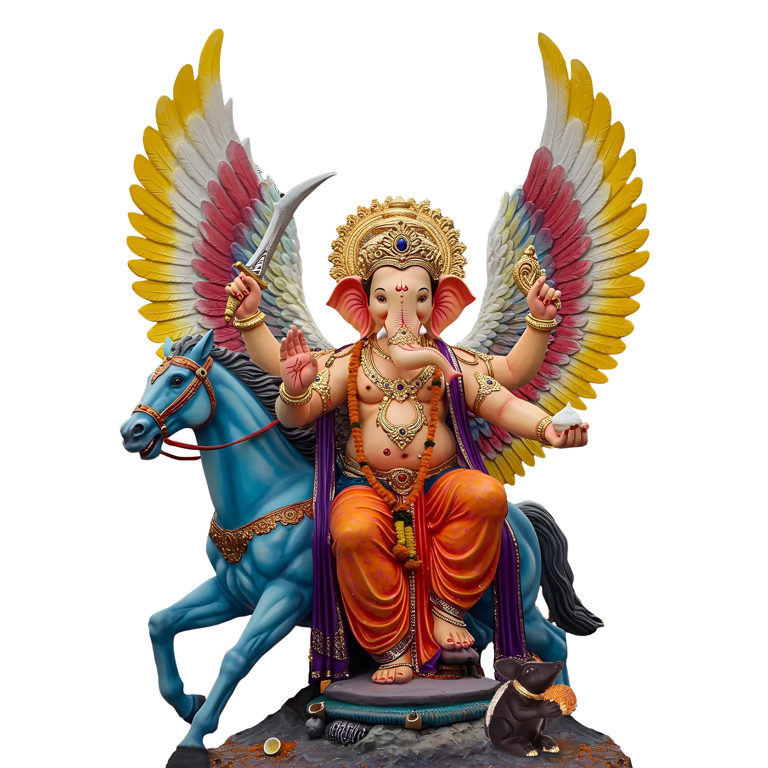 This Ganapati Murti PNG is a captivating and artistic divine idol representation of Lord Ganesha, who is depicted as riding a horse with multicolored wings, and spreading his wings. The intricate and vivid aspects like the orange clothing, brilliant crown, and the magnificently designed ornaments bring out the beauty of Ganapati in this extraordinary way. These types of pictures are the icons of power, faith, and good vibes that are given off by Ganesh Chaturthi festivals. Additionally, the transparency of this PNG allows it to be very versatile for various uses such as in a banner, a poster, a greeting card for social media, or a piece of digital art. A lot of worshipers look for top-notch designs of the Ganapati Murti to present their affection and devotion with, hence, this artwork is a perfect selection for the production of the festival.