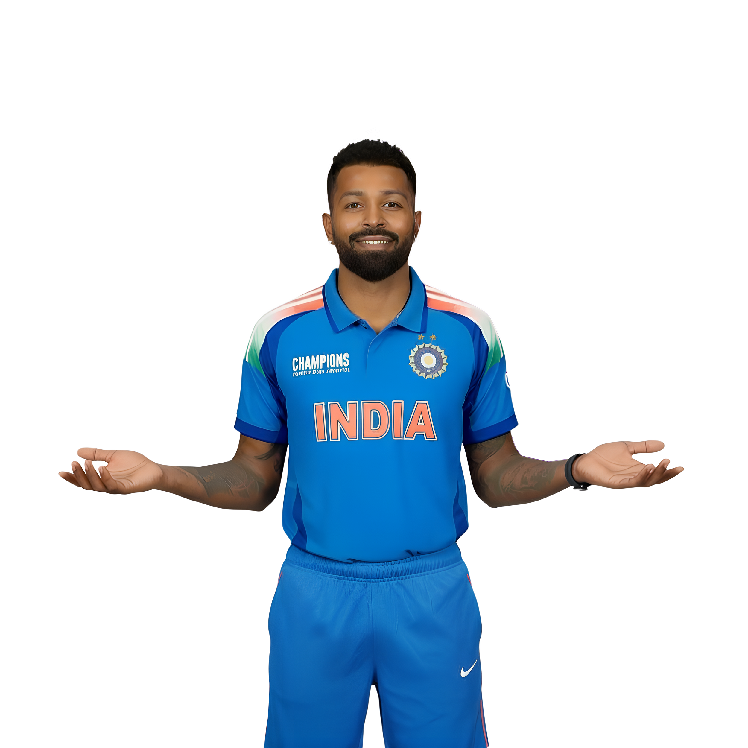 This is a transparent PNG image titled “Hardik Pandya Pose” showing a cricket player with full of confidence and in a casual questioning or expressive gesture by slightly opening both hands. The player is wearing the official Indian cricket jersey. This image with transparent background is very helpful for various kinds of works like photo editing, digital media creation, graphic designing, thumbnail, sports fan pages, etc. Anyone searching for high-quality cricket-related PNG files can freely use such an image for their creative projects.
