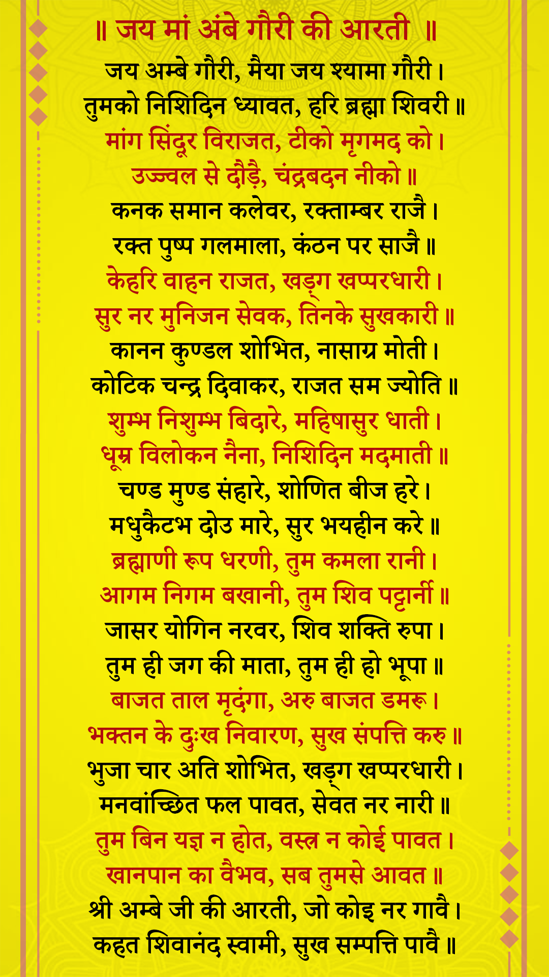 This beautiful Jai Maa Ambe Gauri Aarti in Hindi PNG image is perfect for devotees looking to recite or share the divine aarti during prayers, puja, or festive occasions like Navratri. With the image of the aarti printed in neat Devanagari script on a soothing and bright spiritual yellow background, it is comfortable and attractive for the eye to have the complete aarti reading. It is said that by the repetition of this aarti, blessings, tranquility, and positive vibes flow into one’s life. In case you want to download it for your pleasure, temple worship, or sharing it online, this PNG image would be the perfect devotional material.