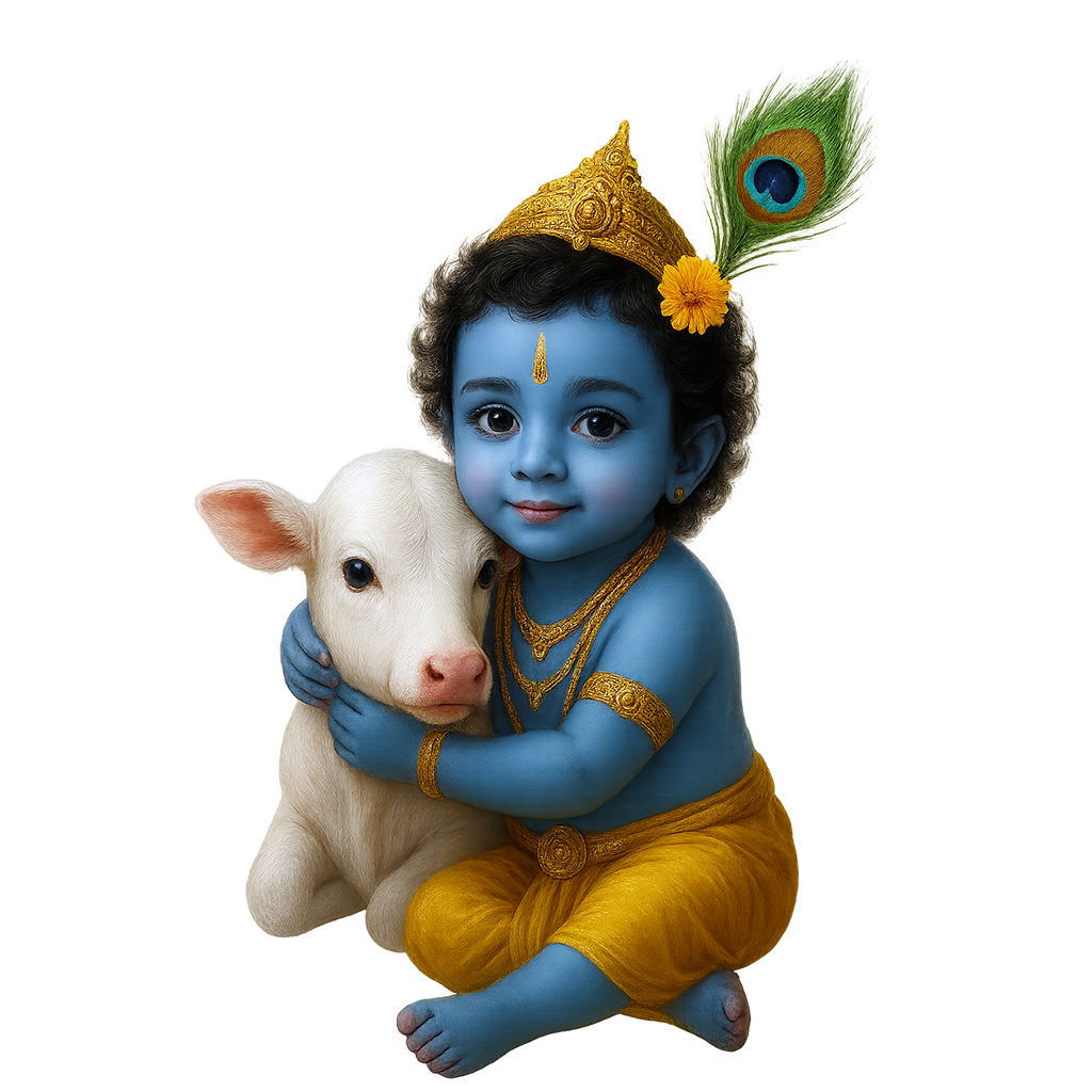 This Krishna Cow PNG beautifully depicts the pure innocence of child Krishna as he tenderly holds a white calf, a classic example of compassion, love and purity.This image is full of charm and devotion due to his enchanting blue skin, golden silk robes, delicate embellishments and iconic peacock feather crown.With a transparent background, it is extremely easy to use it in Janmashtami greeting cards, temple posters, devotional art or spiritual social media posts without any additional hassle.This artwork depicts the sacred bond between Krishna and cows, a theme that has a special place in Hindu culture.