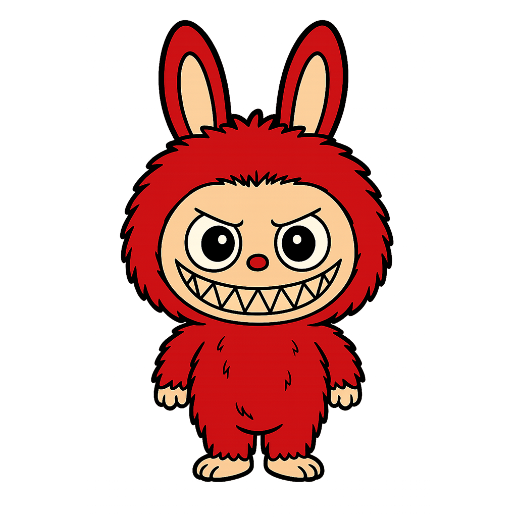 This Labubu clipart features a mischievous and quirky red-furry-eyed character with a rabbit look, triangular teeth and a mischievous smile – thus, it is an easy choice for adding a playful but slightly edgy touch to your creative works.Art toy watchers greatly appreciate Labooboo as one of the most beloved characters in the art toy world due to its unique, bold personality and remarkable style.Since this clipart has no background, it can be effortlessly merged into posters, stickers, t-shirt designs or digital artworks of any sort without the necessity of further editing.You may choose to download Labubu clipart free or have a glance at more cartoon PNG characters for your creative projects to infuse them with a fun, unique vibe.