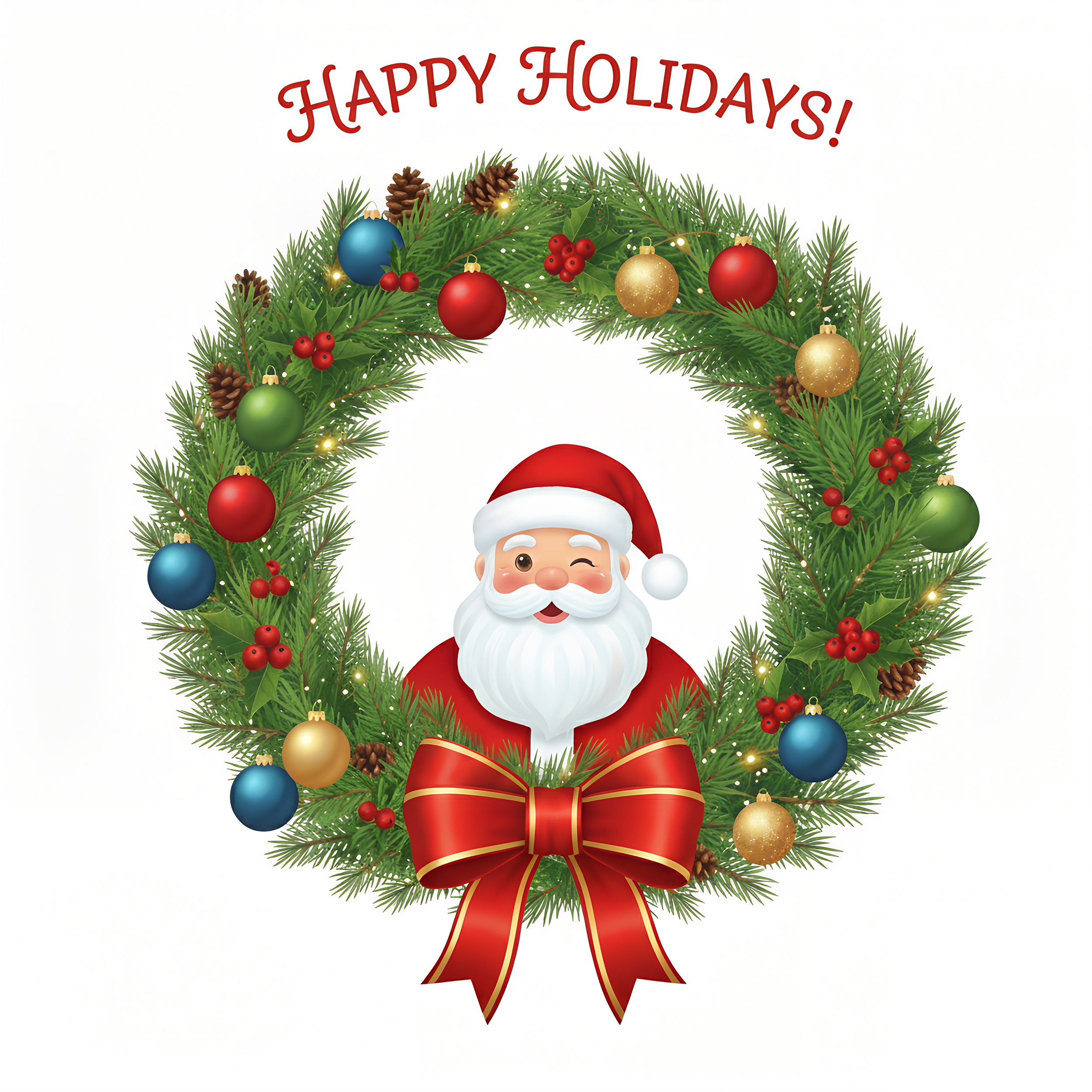 Beautiful Merry Christmas Happy Holiday Card with Santa inside a festive wreath. Perfect for greetings, social posts, and holiday designs.