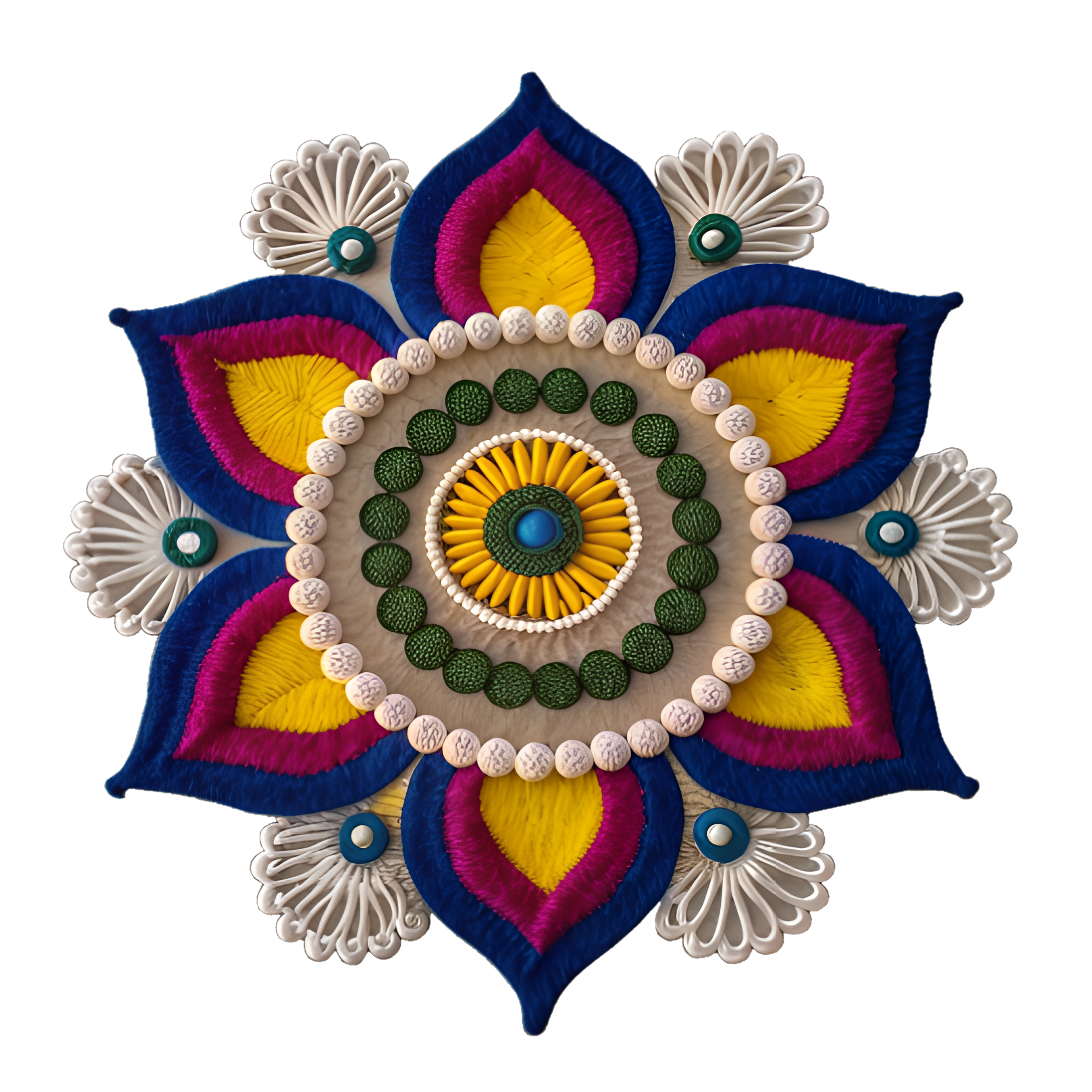 This Rangoli Design for Diwali Easy and Beautiful PNG features a beautiful circular pattern composed of bright colors such as blue, pink, yellow, and green.. This pattern is an artistic expression of the joyful and spiritual aspect of the Diwali festival, and it symbolizes bright energy and wealth. Due to its transparent background, this PNG rangoli is an ideal choice for digital decorations, greeting cards, posters, and festival banners. Whether you're creating party invitation cards or enhancing your graphics projects, this easy and beautiful PNG rangoli is a great way to add an Indian traditional touch to your creative work without much hassle.