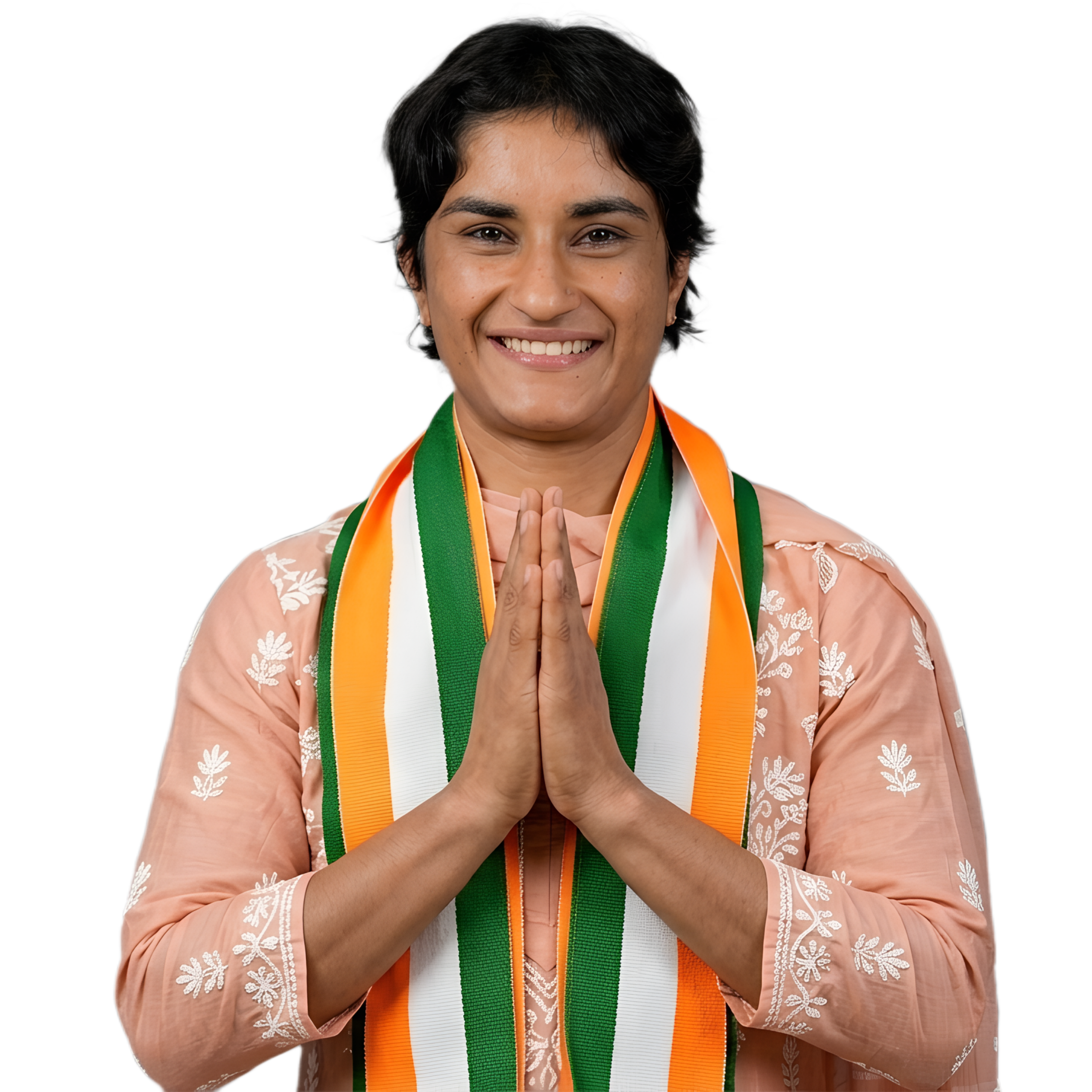 This vinesh phogat photo shows Indian wrestler Vinesh Phogat smiling confidently with folded hands in a respectful Namaste pose, wearing a tricolor scarf that reflects a patriotic theme. The image features a clean cut-out style with a transparent background and HD quality, making it perfect for digital design use without extra editing.